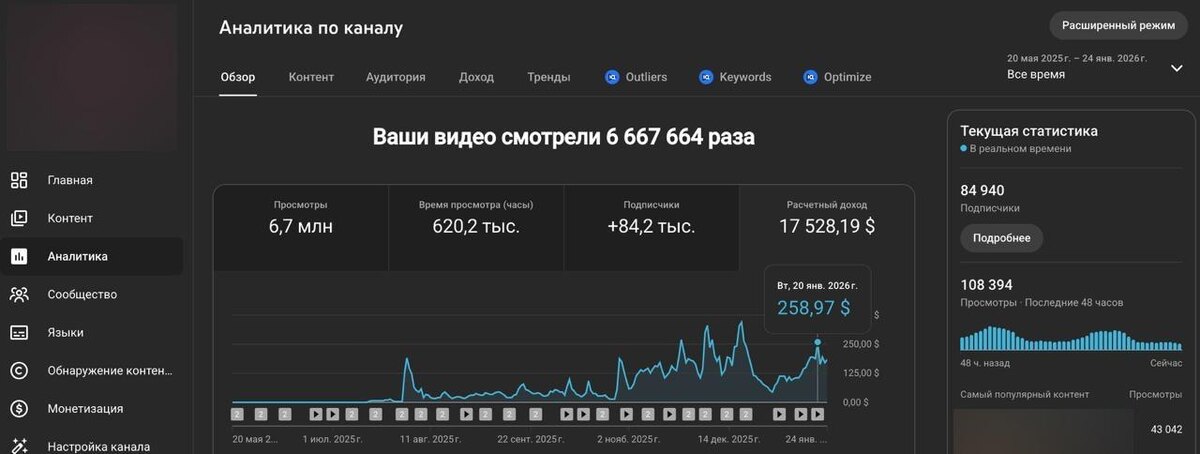 ! 😊 Нашли для вас канал, который можно косвенно отнести к вчерашнему каналу. Этот канал ребята запустили 20 мая, и видно, что был резкий подъём и потом спад. Некоторое время канал корректировался, и потом потихоньку начал набирать. Сейчас на канале уже 17 500$ и он приносит в день 250$ 💰 Отличный пример того, что подход решает всё! 👍 Поэтому снимаем контент, делаем анализ, работаем — и результат будет. Главное — не опускать руки. 💪 YouTube — это инструмент, главное правильно его использовать. 📈