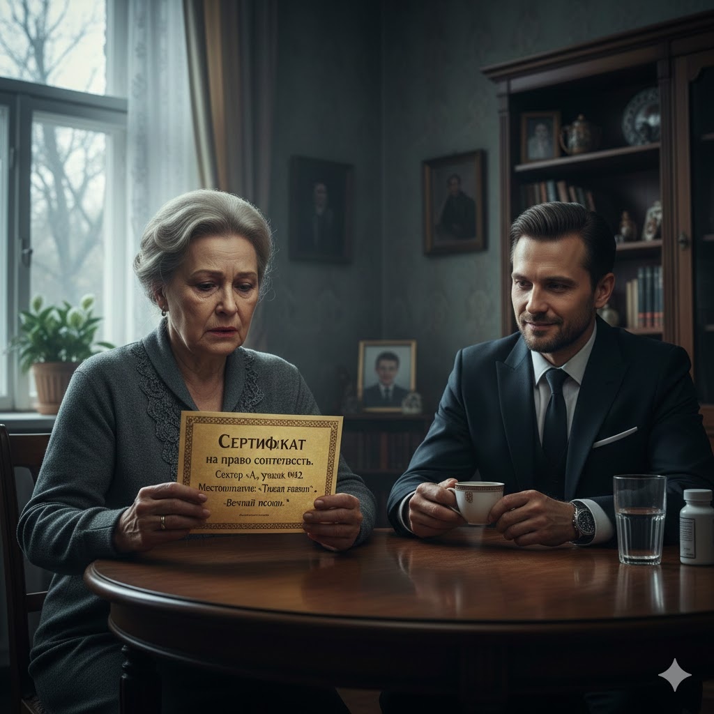 — Сынок... это что за сертификат? «Вечный покой»? — голос её сорвался на шепот. Она перевела взгляд на сына, надеясь, что это какая-то изощренная шутка, современный пранк, который она просто не в силах понять.