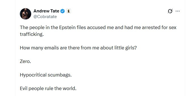 Andrew Tate: 'The people in the Epstein files accused me and had me arrested for sex trafficking…