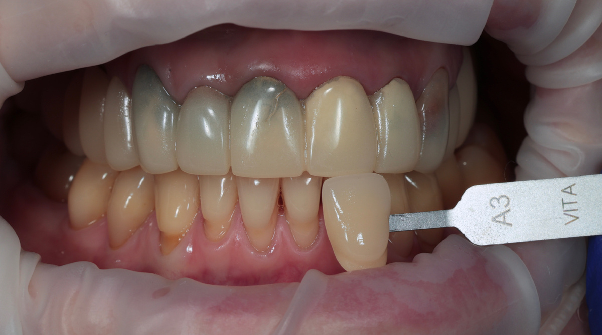 Подбор цвета на тёмных, разноцветных культях - задача сложная. Цвет временных материалов отличается от материалов постоянных. То, что казалось правильным в кресле, да даже при свете дня, дома при другом освещении может выглядеть иначе.
