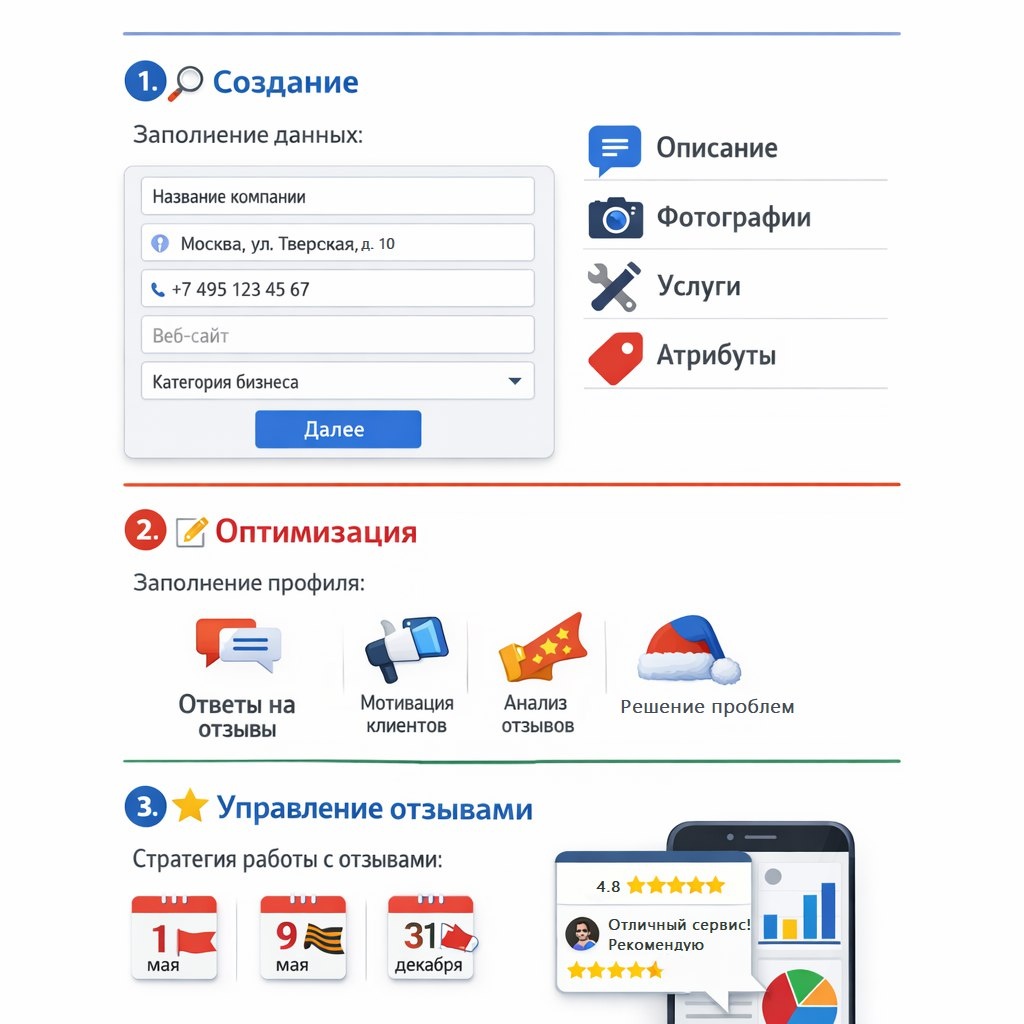 Google My Business (GMB) — это бесплатный инструмент для управления присутствием компании в Google. Для российского бизнеса правильная настройка критически важна для локального SEO. 🎯 Шаг 1: Создание и верификация аккаунта 🔍 Основные данные для России: ✅ Название компании: Полное официальное название на русском ✅ Категория: Точная категория бизнеса (можно несколько) ✅ Адрес: Полный физический адрес с индексом ✅ Телефон: Российский номер в формате +7 (XXX) XXX-XX-XX ✅ Сайт: Основной сайт компании ✅ Часы работы: Актуальное расписание с учетом праздников РФ ⚡ Особенности для России: 🔹 Указывайте адрес на русском языке 🔹 Добавляйте альтернативные номера телефонов 🔹 Учитывайте региональные праздники в часах работы 🔹 Используйте кириллицу во всех полях 🎯 Шаг 2: Оптимизация профиля 📝 Заполнение всех разделов: ✅ Описание: 750 символов, ключевые слова, USP ✅ Фотографии: Минимум 10 качественных фото ✅ Услуги/товары: Полный список с ценами ✅ Атрибуты: Особенности бизнеса (wi-fi, парк