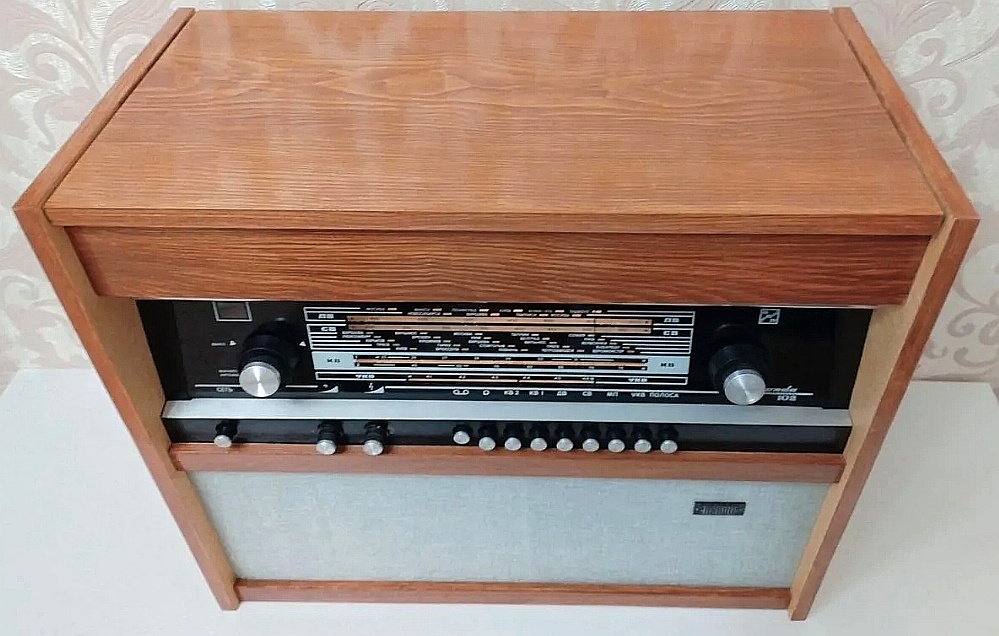 Питался этот внушительный комплекс от бытовой сети переменного тока напряжением 127 или 220 Вольт. Габариты радиолы соответствовали её статусу: 64 см в ширину, 55 см в глубину и 35.5 см в высоту (без учёта ножек). Весила конструкция солидно — 24 килограмма.