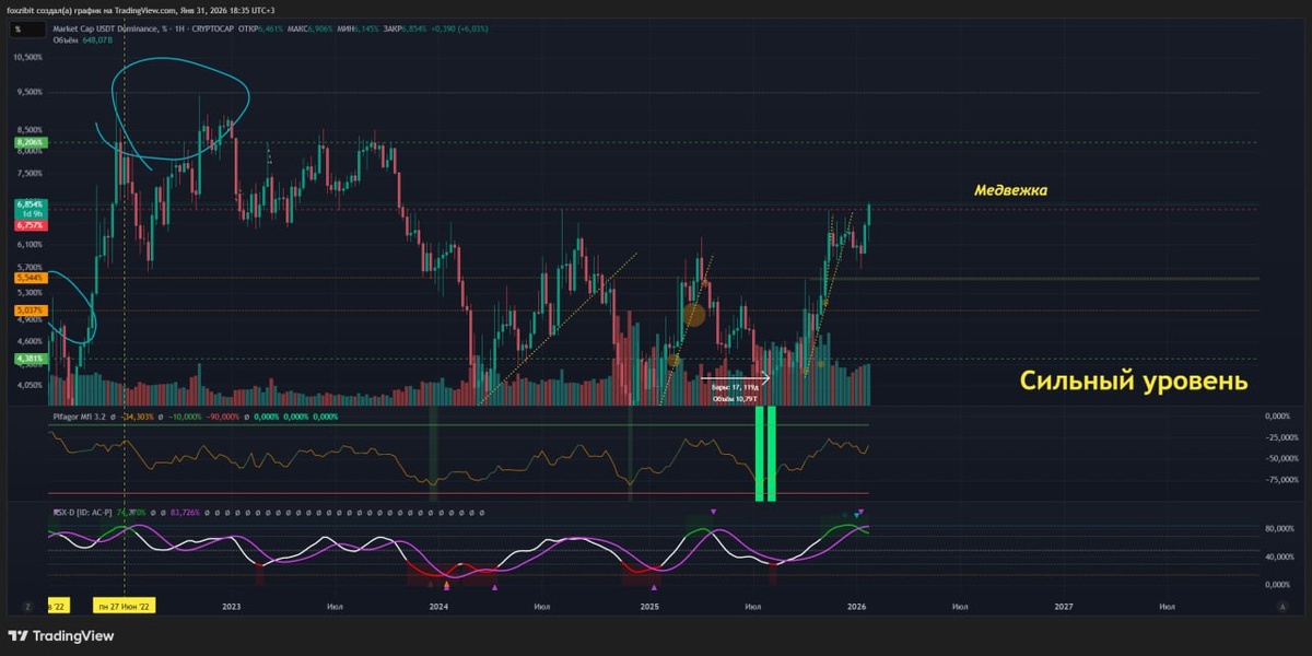 #USDT.D Уровень пробит, девиация сломлена, сценарий роста для меня отменяется. Теперь рынок входит в жесткую стадию капитуляции, покупки буду рассматривать при заходе доминации выше 8,2%. Предварительные дальнейшие цели: Уровень 74к по битку я не рассматриваю (его нет). Уровень 67к для трая на отскок еще можно рассмотреть, 45к - цена для набора портфеля в долгосрок. Я не исключаю какой-нибудь отскок с текущих, но сам не рискну в эту печку лезть) Т.к. пробитие уровня для меня сейчас главный сигнал. $BTC #cryto