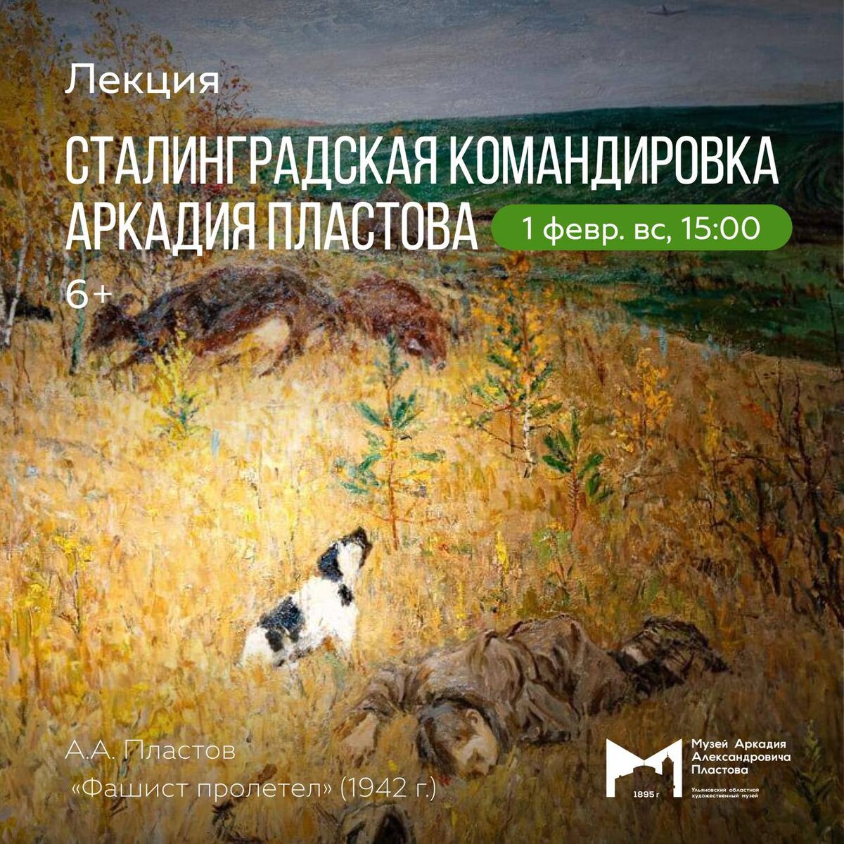 » 🗓️ 1 февраля, 15:00 📍Музей Аркадия Пластова В 1942 году Аркадий Александрович Пластов написал знаменитую картину «Фашист пролетел», изначально называвшуюся «Немец пролетел» — одно из самых значительных живописных произведений о Великой Отечественной войне. Картина получила известность, а сам художник был зачислен в бригаду фронтовых живописцев, направленных в конце 1942 года на Сталинградский фронт с целью отразить в живописи судьбоносный перелом в пользу Красной Армии в ходе Великой Отечественной войны. В январе 1943 года Пластов вместе с товарищами-художниками прибыл на фронт. В течение нескольких дней он был свидетелем завершающей наступательной операции советских войск, разгромивших немецко-фашистские войска под Сталинградом. Увиденное на фронте оказало сильное впечатление на Пластова и повлияло на его творчество. В рамках лекции старший научный сотрудник Музея Аркадия Пластова расскажет о картинах, рисунках и военных плакатах, в которых художник отразил свои впечатления и