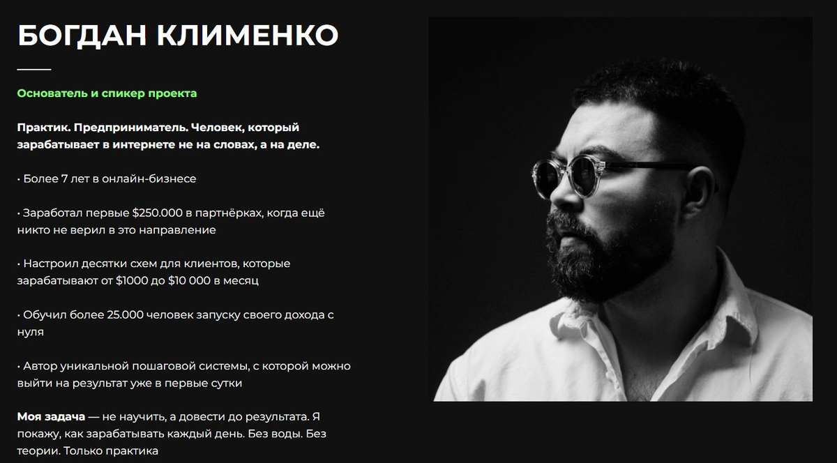 Схема вовлечения потенциальных учеников отточена до блеска. Богдан Клименко использует все классические триггеры инфобизнеса: от демонстрации красивой жизни до обещаний стопроцентной гарантии результата. На его ресурсах вы найдете курсы на любой вкус: "Основы ИИ", "Товарка на 35 площадках" и "Раскрутка соцсетей". Цена за "билет в новую жизнь" постоянно меняется — в начале 2026 года автор предлагал забрать свои наработки за €95, утверждая, что их реальная ценность превышает €200.