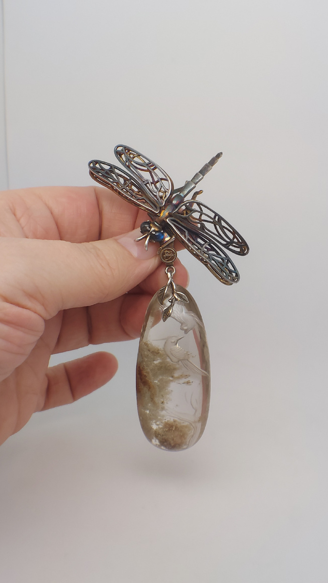 Серебряный кулон "Стрекоза" с великолепной инталией (на оборотной стороне прозрачного камня вырезан углубленный рельеф) на кварце с включениями. Включения, предположительно - хлорит и серицит. Глаза инкрустированы лабрадорами.
