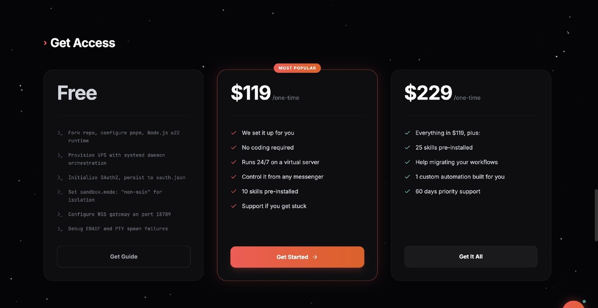 Стартап RyzeAI заработал $17 000 за три дня, предлагая платную установку опенсорсного ИИ-агента Clawdbot (сейчас переименован в OpenClaw). За $119 команда разворачивала проект на сервере клиента и присылала данные для входа. Технически это одна команда в терминале, но клиенты платили, чтобы не видеть его вообще. За $229 добавляли больше предустановленных навыков и помощь с миграцией. Также был доступен бесплатный гайд, на лендинге его описали максимально пугающим техническим языком: «Fork repo, configure pnpm, Debug EBADF and PTY spawn failures». Читать далее https://habr.com/ru/news/991354/?utm_source=habrahabr&utm_medium=rss&utm_campaign=991354