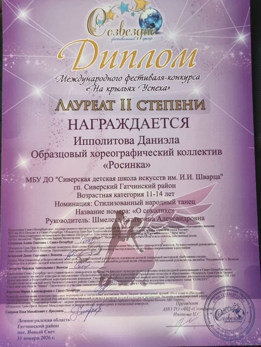 31 января солисты коллектива Шорникова Мария, Исакова Варвара , Виноградова Анастасия и Ипполитова Даниэла принимали участие в Международном фестивале-конкурсе "На крыльях Успеха", организованным Фестивальным центром "Созвездие" Трио "Психотипы" Лауреат 2 степени💐 Соло "О соколике" Лауреат 2 степени💐 Поздравляем наших девочек с прекрасным выступлением и отличными результатами👏👏👏 Наш инфопартнер Сиверский.нет Наш канал в Max, вступайте Источник: Открыть