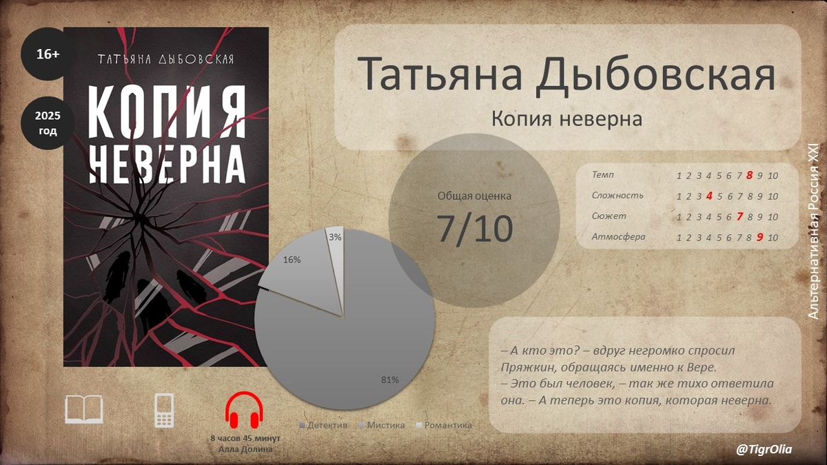 Рекомендую эту книгу не как безупречный триллер, а как детектив с блестящей фантастической идеей, где атмосфера и глубина задумки стоят знакомства. И если появится продолжение, что раскроет тайны доппельгангеров глубже — а меня в сиквеле привлекает именно развитие этого мира — я буду первой в очереди на чтение.