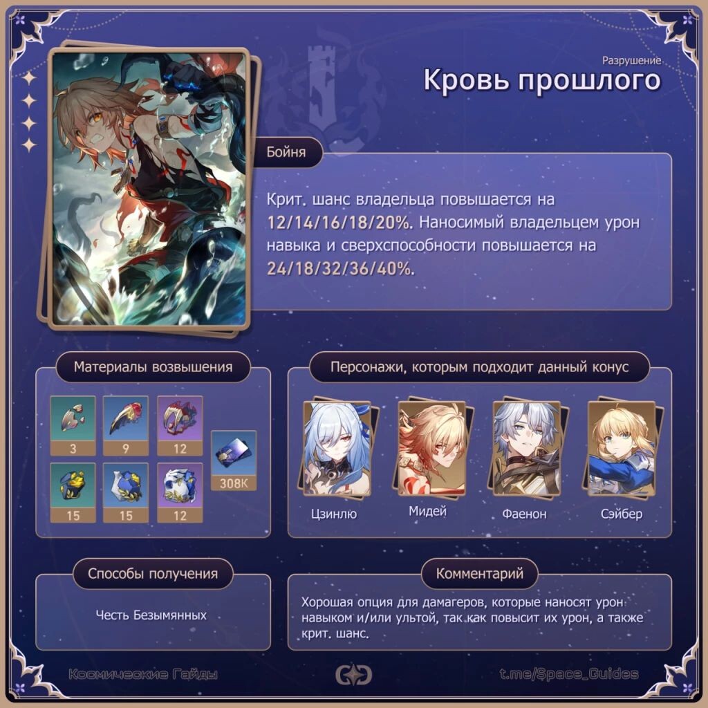 ㅤДанный Световой конус подойдёт большинству персонажей Разрушения, которые нуждаются в критах и наносят урон навыком и сверхспособностью: Фаенон, Мидей, Цзинлю, Сэйбер, Арлан, Хук, Первопроходец Пути Разрушения.