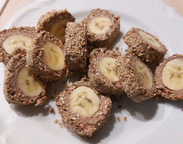 А тем временем раскрошите печенье. Достаньте из холодильника творожно-банановую колбаску, разверните и хорошо обваляйте в крошках. Выложите на тарелку.