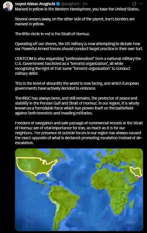 ‘US military… attempting to dictate how our Powerful Armed Forces should conduct target practice in their OWN turf’ — Iran’s FM Araghchi