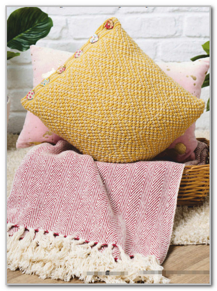Вам потребуется: пряжа Cascade Yarns 220 Superwash (100% шерсть, 200 м/100 г) по 100 г - пряжи A бежевого цвета (Antiqued Heather 369) и пряжи B желтого цвета (Daffodil 821), круговые спицы 4 мм длина 40–60 см, маркер петель, вкладыш для подушки (30 см × 30 см), 6 пуговиц (диаметр 20 мм).