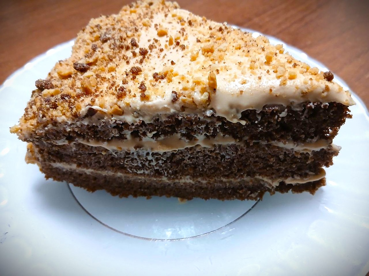 Этот шоколадный бисквитный торт с творожным кремом — настоящее лакомство для сладкоежек! Нежный шоколадный бисквит, пропитанный кремом из творожного сыра и вареной сгущенки, создает неповторимый вкус. Добавьте орехи и свежие фрукты для дополнительной текстуры и аромата. Этот торт станет идеальным завершением любого праздника или уютного семейного ужина. Ингредиенты: Для бисквита: - Яйца — 6 шт. - Сахар — 180 г - Щепотка соли - Кипяток — 3 ст. ложки - Растительное масло — 40 г - Мука — 160 г - Какао — 30 г - Разрыхлитель — 1 ч. ложка - Ванилин — по вкусу Для крема: - Творожный сыр — 250 г - Вареная сгущенка — 250 г - Сливочное масло — 100 г - Орехи и фрукты — для прослойки по желанию Приготовление: 1.Бисквит - Взбейте яйца с сахаром и солью до пышной массы. - Постепенно добавьте кипяток и растительное масло, продолжая взбивать. - В отдельной миске смешайте муку, какао и разрыхлитель. Просейте эту смесь в яичную массу и аккуратно перемешайте до однородности. Добавьте ванилин. - Выпекайте