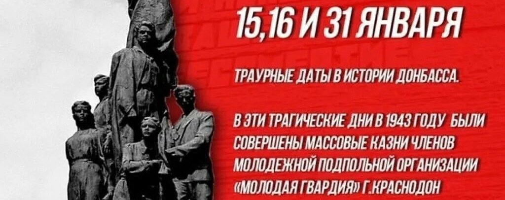 Немцы захватили город в июле 1942 года. И уже через 2 месяца после оккупации молодые ребята создали подпольную организацию, которую назвали "Молодая гвардия". Подпольщики были раскрыты в начале 1943 года; почти все они были арестованы. Молодых людей жестоко пытали (подвешивали за волосы, сажали на раскаленную плиту, вырезали на спине пятиконечную звезду, прижигали тело каленым железом и раны посыпали солью). Большинство из них были расстреляны в ночь на 15 января 1943 года, их тела были сброшены в шурф шахты №5. Некоторых молодогвардейцев фашистские изверги сбросили в шурф живыми... Спасательные работы по извлечению трупов проводили 8 дней. Трупы были обезображены до неузнаваемости. Многие родители узнавали детей только по одежде. Многие тела достали без рук и ног. У шурфа дежурил врач и приводил в чувства родителей, которые теряли сознание. Извлекли 71 тело. Похороны погибших состоялись 1 марта 1943 года.