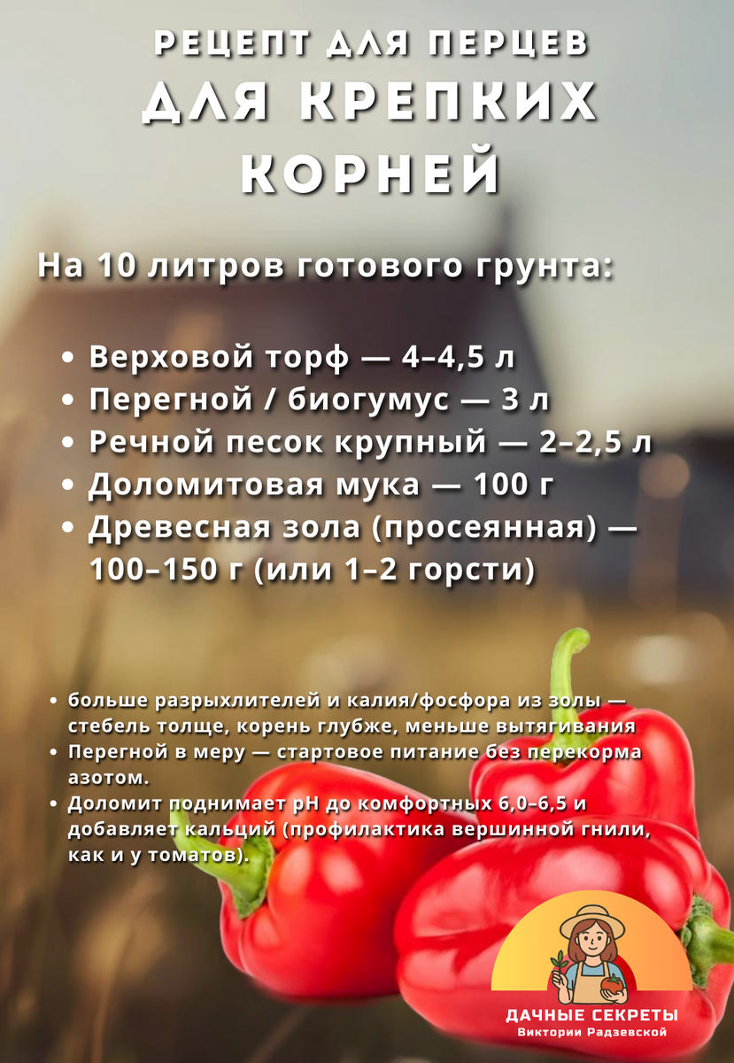 Привет, друзья. Сегодня делюсь еще одним рецептом грунта, который можете составить самостоятельно в домашних условиях. Это рецепт для тех, у кого рассада чаще всего вырастает со слабой корневой системой. Что требуется для составления почвенной смеси на 10 литров для рассады перца: Для мощной корневой системы делаем рыхлый грунт, в котором корни легко прорастают на глубину и наращивают боковые побеги. Калий и фосфор, который содержится в древесной золе также стимулирует рост мощной корневой системы. Перегной добавляем в меру, чтобы не было переизбытка азота. Доломитовая мука также необходима для того, чтобы почва была не кислая. Это влияет на развитие рассады перца. Ещё больше на моих аккаунтах в Телеграмм. Читать в МАХ - https://max.ru/garden_secrets Читайте также: