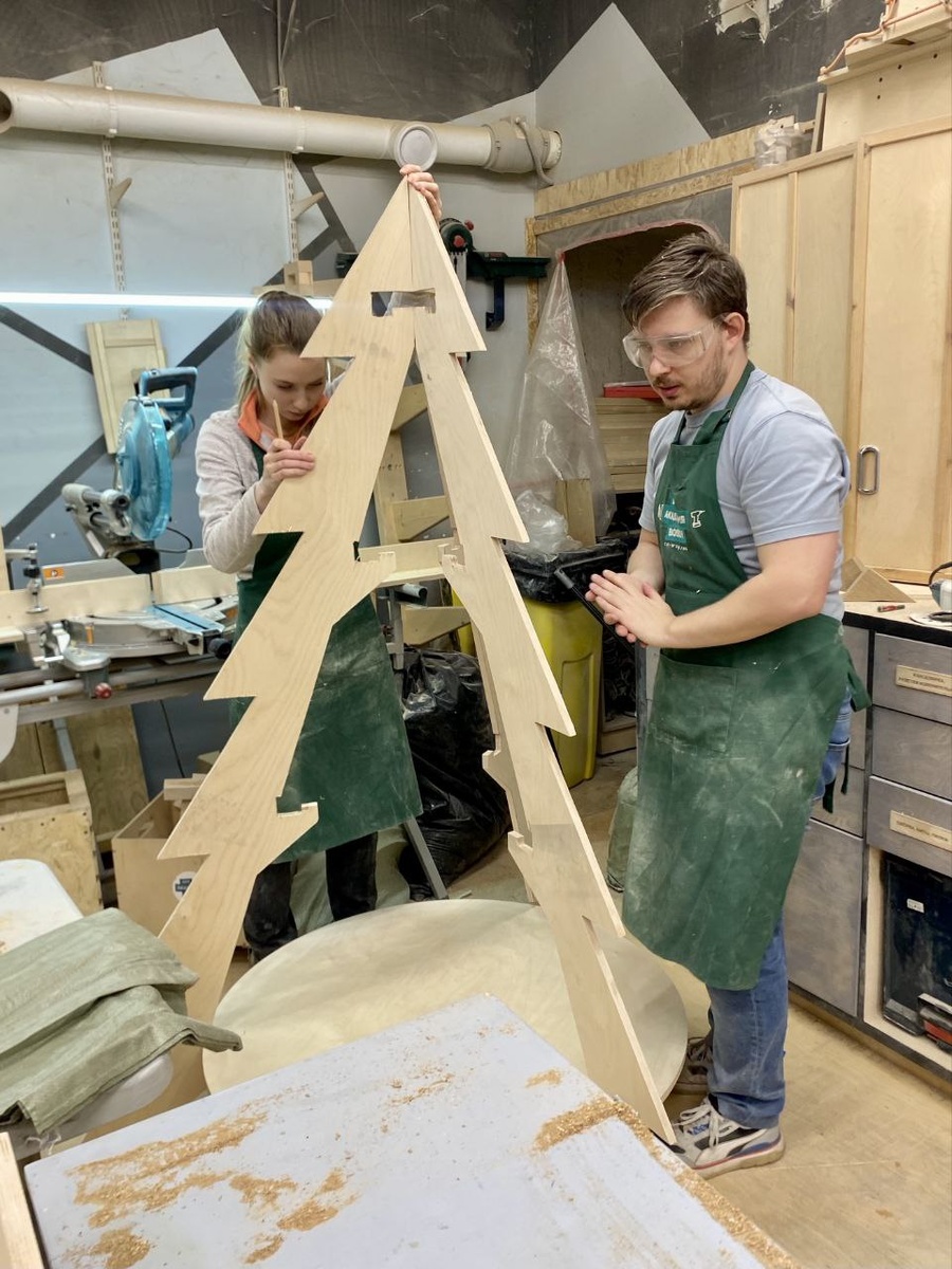 За 2 недели до Нового года Максим написал нам о том, что хочет сделать ель нестандартной конструкции из фанеры, высотой более 1.5 метров