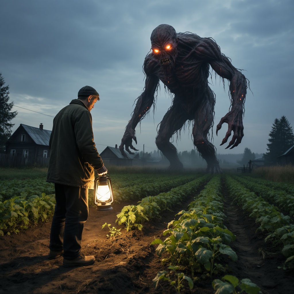 В 1959 году в глухой деревушке Подболотье, затерянной среди лесов северной губернии, жил Иван Фёдорович — мужик крепкий, неробкий, привыкший к ночным походам по своим наделам. Осень выдалась сухая, и он решил выкопать картошку на дальнем поле до первых заморозков. Взял фонарь, лопату и отправился в сумерках, пока ещё было видно, куда ступаешь. Поле лежало за околицей, за старым берёзовым перелеском. Дорога туда шла через покосившийся мостик над ручьём, а дальше — тропа меж высоких кустов и бурьяна. Иван шёл не спеша, насвистывая себе под нос, пока не вышел на открытое пространство, где рядами темнели картофельные ботвы. Он разложил фонарь на земле, воткнул лопату в рыхлую землю и начал работу. Воздух был прохладный, пахло прелой листвой и сырой землёй. Где‑то вдали ухала сова, да изредка шелестел ветер в кронах. Минут через двадцать Иван замер. Ему показалось, что за спиной кто‑то есть. Он медленно обернулся, держа лопату наготове. Поле было пустым, лишь колыхалась трава под ветром. Но