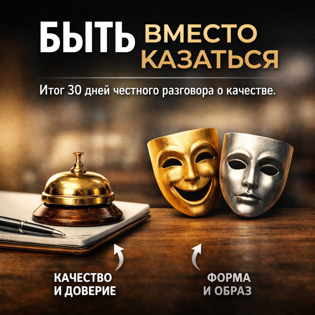 Итог 30 дней честного разговора о качестве Эти 30 дней были не про тексты. И не про контент. Они были про одно простое и неудобное различие: казаться и быть. Мы разобрали десятки подмен, которые я вижу годами в гостеприимстве и туризме: • отчёт вместо реальности, • подпись вместо ответственности, • форма вместо содержания, • оболочка вместо сути, • скорость вместо качества, • решение вместо понимания, • привычка вместо развития, • соответствие вместо заботы, • инструкция вместо здравого смысла, • минимум вместо стремления. Во всех этих ситуациях система формально работает. Но качество - нет. И главный вывод, к которому я снова и снова возвращался: качество не ломается из-за отсутствия стандартов. Оно ломается там, где исчезает личный выбор быть качественными. Быть - значит: • видеть живого гостя, а не процесс, • доводить ситуацию до спокойствия, а не до галочки, • отвечать не «по правилам», а по совести, • делать лучше, даже когда никто не требует, • оставаться профессионалом, даже ког