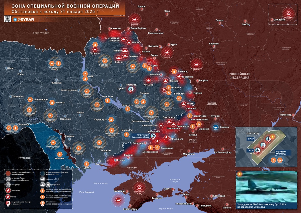 🔸Российские войска нанесли удар дронами БМ-35 по аэродрому в Миргороде, управляемых по «Старлинку». Поражены по меньшей мере два Су-27 и 1 F-16. Второй день продолжается энергетическое перемирие, обе стороны которое полностью соблюдают. 🔸На территории т.н. Украины из-за массового обледенения линий электропередачи и значительных повреждений после прошлых атак произошло каскадное отключение энергосети в нескольких областях. Перебои затронули даже соседнюю Молдавию. Стабилизировать обстановку удалось ближе к ночи, однако подключение отопления займет не меньше суток, а на страну надвигаются сильные морозы. Только в Киеве около четырех тысяч домов остаются без тепла. 🔸На Купянском направлении сохраняется сложная обстановка в окрестностях Купянска-Узлового. В условиях ложных докладов массовая публикация противоречащих друг другу кадров с окрестностей города лишь добавляет проблем бойцам на земле. 🔸На Восточно-Запорожском направлении подразделения 114 мсп 127 дивизии 5 армии освободили н
