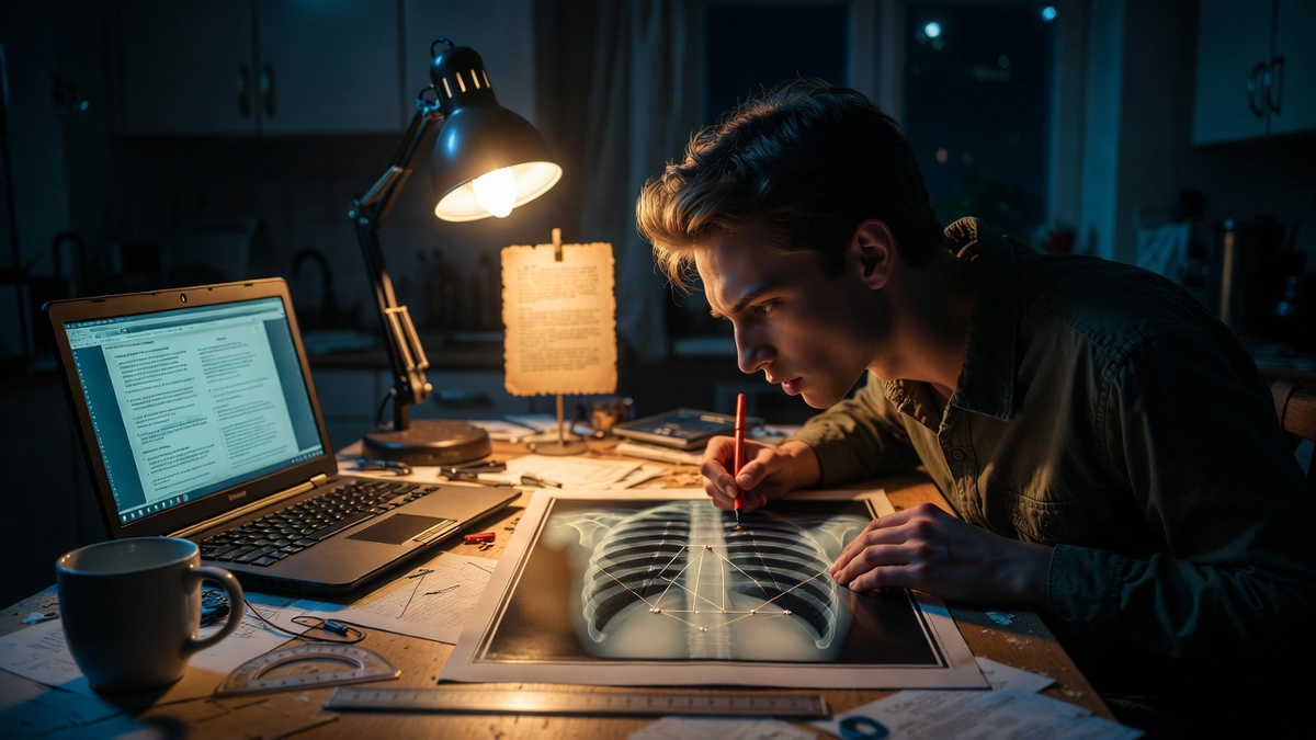 Три бессонные ночи Артём провёл за кухонным столом, превратив его в штаб квартирного сыщика. Чай сменился кофе, а затем просто водой — нужно было сохранять ясность ума. Пергамент и рентгеновский снимок висели на стене, соединённые нитями с фотографиями деталей. Отправной точкой стал тот самый символ «солнца с точкой». Артём, перерывая учебники по иконографии и алхимическим трактатам, выяснил, что подобный знак часто обозначал не просто светило, а философский концепт — «Божественный источник» или «Единое начало». И в системе координат диаграммы Леонардо он занимал центральное, доминирующее положение. Это открытие стало прорывом. Оно означало, что шифр и диаграмма говорили на одном языке — языке символов и геометрии. Цифры в столбцах пергамента, которые прежде казались хаотичными, теперь обрели потенциальный смысл: это могли быть не буквы, а указатели. Углы. Расстояния. Координаты на той самой скрытой сетке, что проступала на рентгене. Артём, вооружившись транспортиром и линейкой, начал