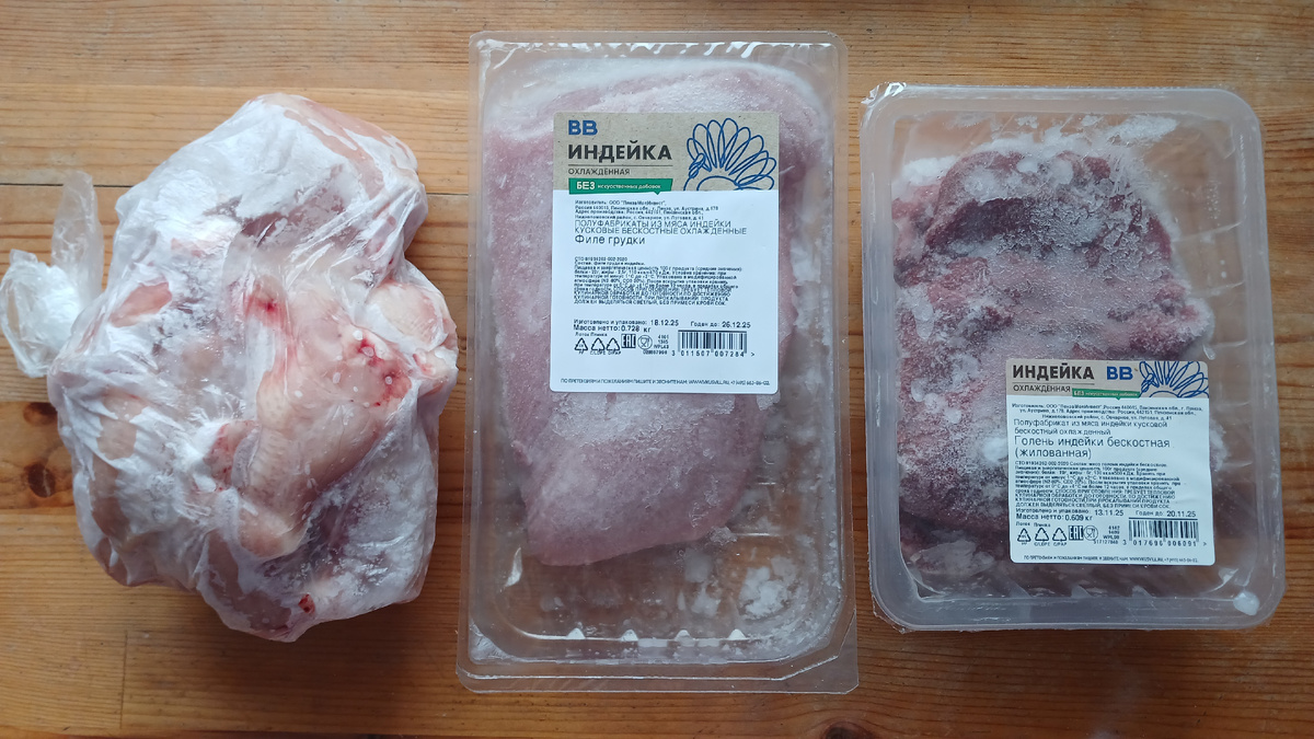 филе грудки индейки, филе голени индейки и 1 кг крыльев (которые я насобирала при разделке целых тушек)