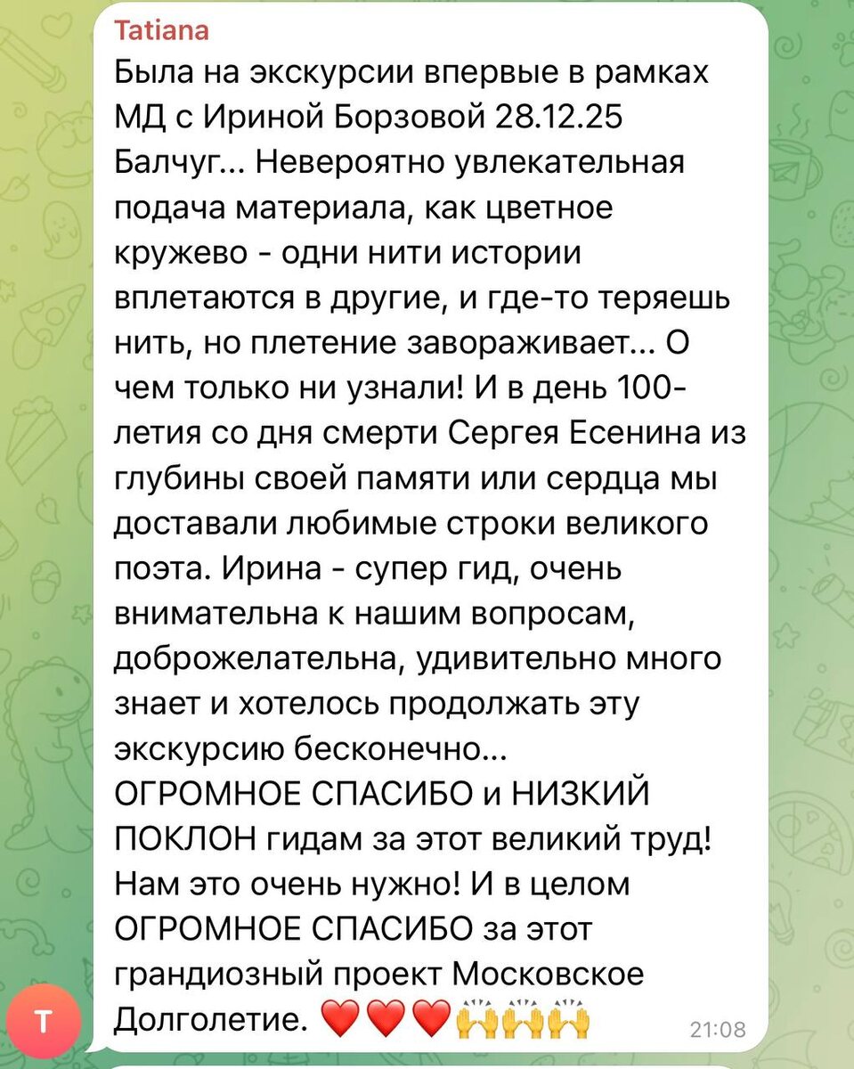 Сегодня администратор чата попросила участников написать отзывы о работе экскурсоводов проекта. Отзывов написали много. Огромная благодарность за каждый! Но мне особенно понравился отзыв выше. Как красиво и с душой написано. Спасибо. Спасибо!