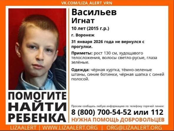 Игнат Васильев ушел гулять и не вернулся домой. Рост ребенка - 130 см, он худощавого телосложения со светлыми волосами и зелеными глазами. На момент исчезновения был одет в черную куртку, темно-зеленые штаны, синие ботинки и черную шапку с синей полосой. Родители обращаются ко всем жителям города с просьбой помочь найти сына. Сообщить любую информацию можно по телефону горячей линии 8-800-700-54-52 или экстренным службам по номеру 112.