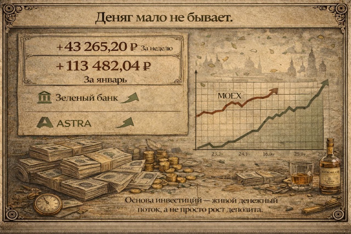 На этой неделе на счета поступила сумма в размере 43 265 рублей 20 копеек. Немного, но всегда хочется большего. За январь пришедшая сумма составила 113 482,04. Всё ушло на покупку зелёного банка, на остатки были куплены бумаги Астры. Несмотря на падение рынка в последние дни месяца, счет продолжает расти, и рост происходит выше индекса ММВБ и это не может не радовать. Не устану повторять, о том, что основой инвестиций является живой денежный поток, а не простой рост депозита. ——— ⚠️ *Данная информация не является индивидуальной инвестиционной рекомендацией. Ваши инвестиционные решения должны приниматься на основе комплексного анализа, а не только на основе мнений отдельных инвесторов.