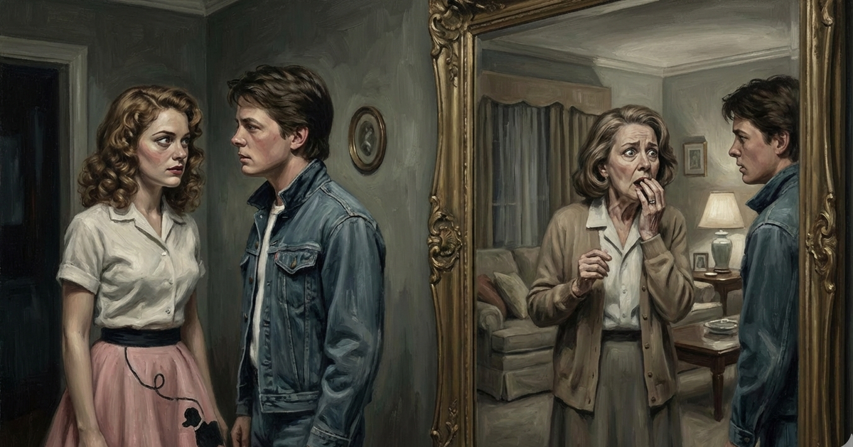 Это главная сюжетная дыра великой трилогии. Марти Макфлай попадает в 1955-й, знакомит родителей, мать в него влюбляется (!), отец с его помощью становится крутым. Проходит 30 лет. У них растет сын, точная копия того парня, который перевернул их жизнь. И они... не замечают? Теория простая: Лоррейн и Джордж узнали его. Но человеческая психика устроена так, что она блокирует невозможные или травмирующие воспоминания. Признать, что твой сын — это тот самый парень, в которого ты была влюблена в школе (и целовалась в машине!) — это инцестуальный кошмар. 1. Лоррейн была влюблена по-настоящему «Кельвин Кляйн» был её первой любовью. Он был загадочным, играл рок-н-ролл, дрался. Такое не забывается. Когда Марти подрастает, Лоррейн должна испытывать жуткое дежавю. Её мозг выбирает защиту: «Это просто совпадение». 2. Джордж и его наставник Для Джорджа Марти был ментором. Человеком, который научил его бить Биффа. Джордж написал книгу про пришельца с лицом Марти. То, что он не видит сходства — это ко