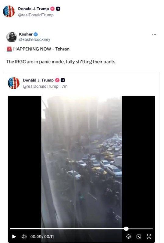 🇺🇸 Трамп перепостил публикацию о КСИР, отметив, что в Тегеране у них паника.