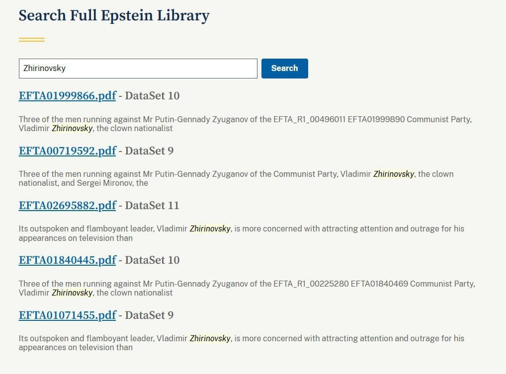 В последнее время в сети активно обсуждают имя Владимира Вольфовича Жириновского в контексте файлов Эпштейна. ❗️Многие каналы распространяют недостоверную информацию о его якобы прямом отношении к этому делу. На самом деле, имя Жириновского упоминается лишь в двух статьях: американского журнала Foreign Affairs и издания The Economist за 2011 и 2012 годы. ❗️Причины, по которым эти материалы оказались в опубликованных Минюстом США pdf-файлах, остаются неясными. Будьте внимательны к источникам информации Lesen Sie weiter unten auf Deutsch...