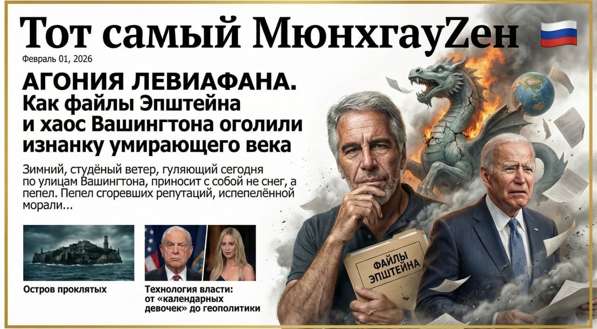 🚨 Колонка МюнхгауZена: Агония Левиафана. Как файлы Эпштейна и хаос Вашингтона оголили изнанку умирающего века - Часть 3️⃣/3 Бывший аналитик ЦРУ Ларри Джонсон констатирует: «Что он [Трамп] может сделать? США больше не контролируют все финансовые рычаги». Санкции против России, заблокировавшие ей доступ к SWIFT, обернулись бумерангом, ускорив поиск альтернатив. Долларовая гегемония, этот краеугольный камень американского могущества, даёт первые, но уже необратимые трещины. 🇷🇺 Взгляд из Москвы: спокойствие силы и логика многополярного мира На фоне этого западного карнавала Россия являет собой картину принципиально иного свойства. Не истерику, а выдержку. Не хаотичные подёргивания, а последовательную, стратегическую работу. ✨ Суверенитет как базовая реальность Наша страна давно прошла этап иллюзий о «партнёрстве» с Западом. Его элиты, погрязшие во внутренних разборках и моральном упадке, неспособны быть последовательными партнёрами. Их слово ничего не стоит, их договоры — предмет т