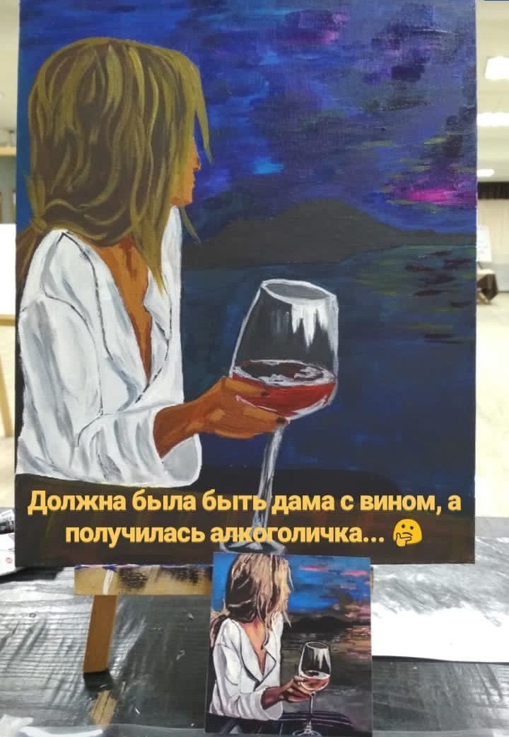Эту работу рисовала акрилом в 2019 году - мой проверочный тест после 20 летнего перерыва. Внезапно решила посетить арт-вечеринку в Усинске. Выполняли девушку с бокалом вина под бразильские ритмы, с шампанским для настроения, и было всего полтора часа, чтобы вспомнить, каково это — просто смешивать краски и ни о чем не думать. А еще это дверца, которую я приоткрыла тогда, спрашивая себя: «А если попробовать вернуться к творчеству?». P.S.: Сори за качество, т.к. работа уже благополучно подарена. Осталось только это фото с припиской о моем тогдашнем впечатлении, что по моему мнению у меня получилось. Внизу, под мольбертом копия оригинала.