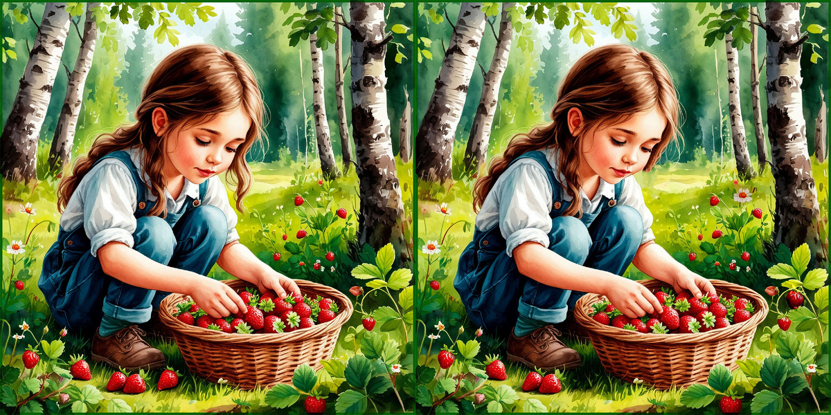 Представьте себя на залитой солнцем поляне, где среди сочной зелени краснеют спелые ягоды. Вот маленькая помощница с энтузиазмом собирает землянику, мечтая о вкусном варенье или пироге. Кажется, идеальная летняя идиллия... Но даже в такой прекрасной картине могут быть свои маленькие загадки! Попробуйте найти 6 отличий, которые спрятались в этом милом моменте. Добро пожаловать на мой канал! Каждый день я предлагаю Вам новые логические задачки, чтобы немного расслабиться и переключиться. Думайте, решайте, разгадывайте, пишите ответы в комментариях. * * * Поиск отличий на двух почти одинаковых картинках — это увлекательное занятие, которое способствует развитию внимания, наблюдательности, концентрации и усидчивости. К тому же - это просто весело и интересно! Наслаждайтесь! * * * Итак, попробуйте найти 6 отличий между этими картинками. Нажмите на картинку, чтобы она открылась в большом размере. Ответы, как всегда, можно подсмотреть в галерее ➡ И те же самые картинки в вертикальном формате