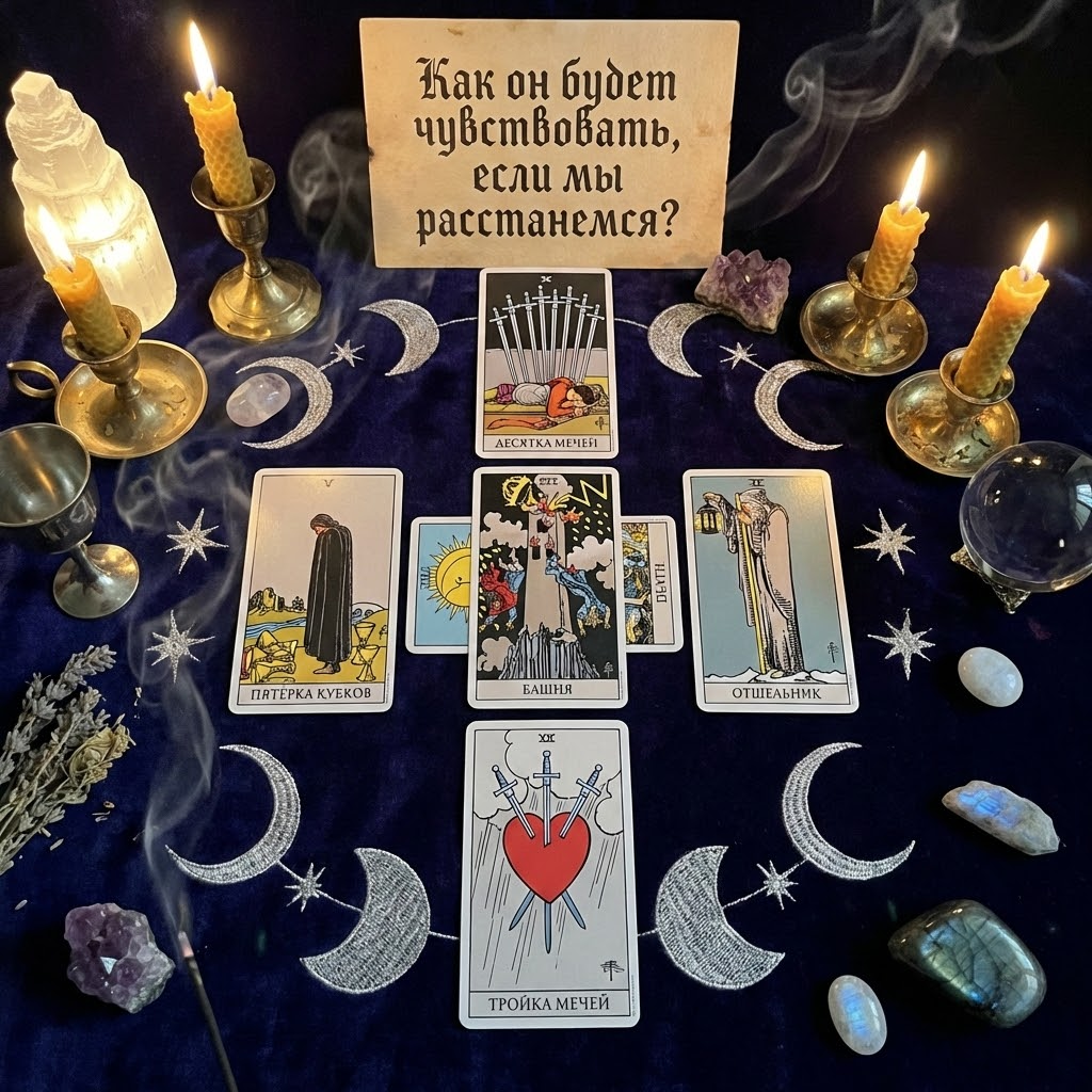 Этот расклад показывает, что расставание не будет для него лёгким, даже если он попытается скрыть свои чувства за рациональностью. Его смятение и тяжесть говорят о том, что он ценит вашу связь глубже, чем может показывать. Король Мечей указывает на то, что он постарается сохранить лицо и не дать эмоциям взять верх, но это не отменяет внутреннюю боль. Если вы обдумываете расставание, важно учитывать, что оно оставит след в его душе, и подойти к этому шагу с максимальной честностью и деликатностью.
