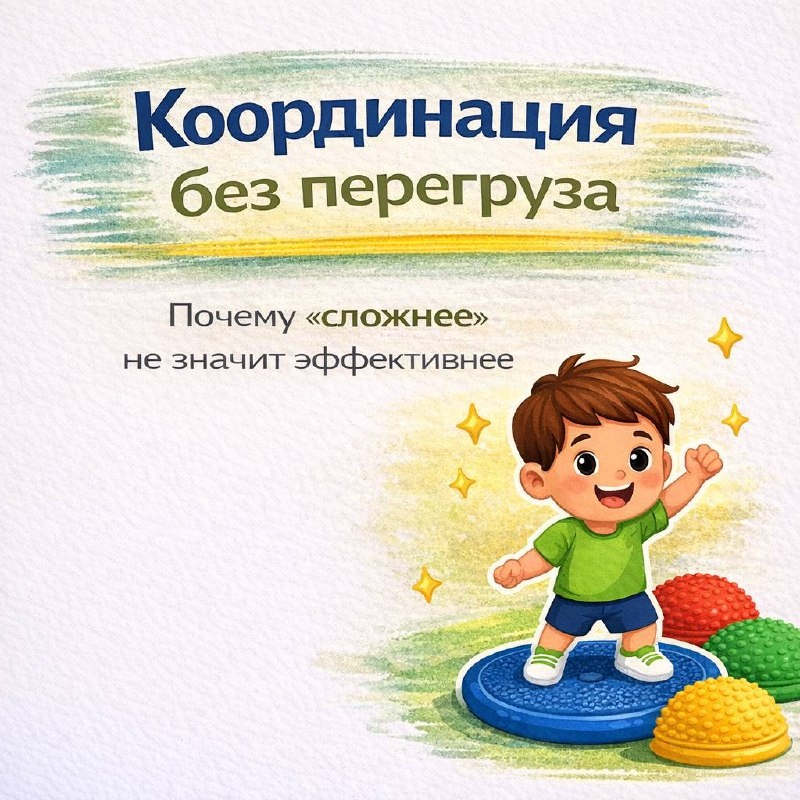 Координация — это не про сложные задания и не про «чем труднее, тем лучше». Очень часто мы видим обратное: чем больше перегруз,тем хуже тело собирается. Когда ребёнку сразу предлагают: — сложную схему — быстрый темп — много условий — контроль «держи / не падай» нервная система уходит в защиту. Появляется спешка, зажимы, компенсации.Координация не развивается — она рассыпается. На практике координация растёт тогда, когда: — есть понятная опора — движение укладывается в тело — темп позволяет почувствовать действие — задание не требует «выживать» Иногда самое координационно сложное —это простое движение, сделанное спокойно и осознанно. Без гонки. Без лишних условий. Без давления. Именно так тело начинает собираться,удерживать, переносить,связывать движения между собой. Координация без перегруза — это не упрощение. Это точная работа.