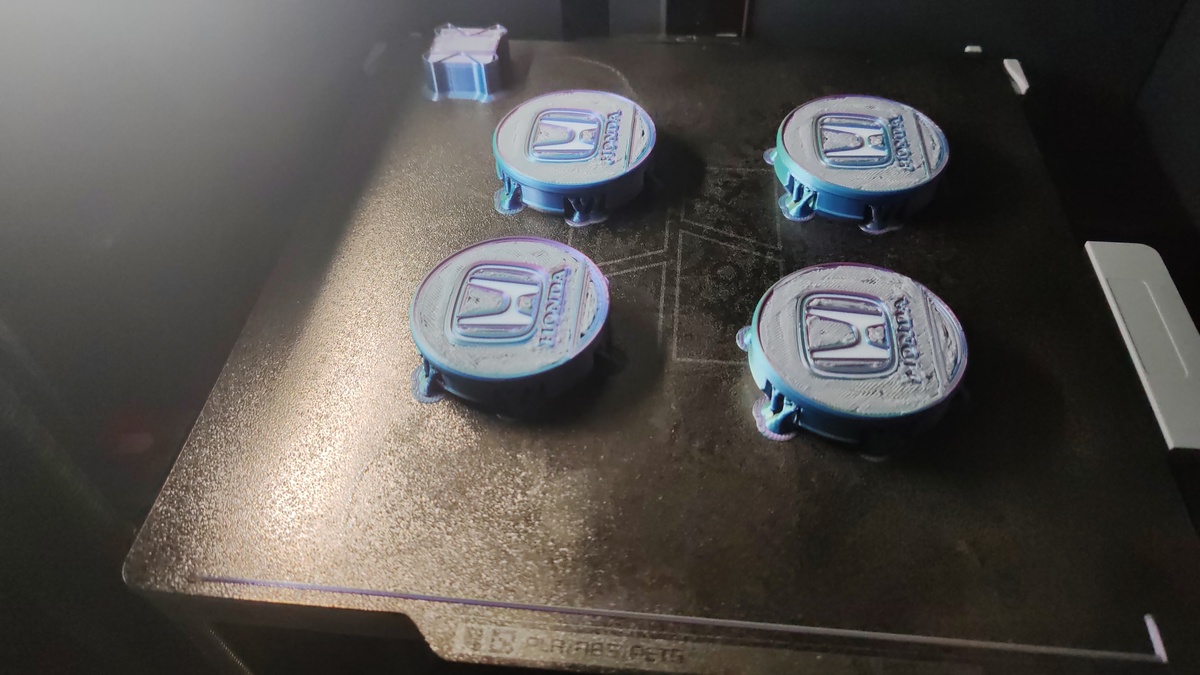 Решил немного заморочиться и попробовать 3D-печать для машины. Давно чесались руки что-нибудь сделать самому, а не заказывать/искать готовое. В итоге напечатал колпачки с логотипом Honda (на фото как раз они).