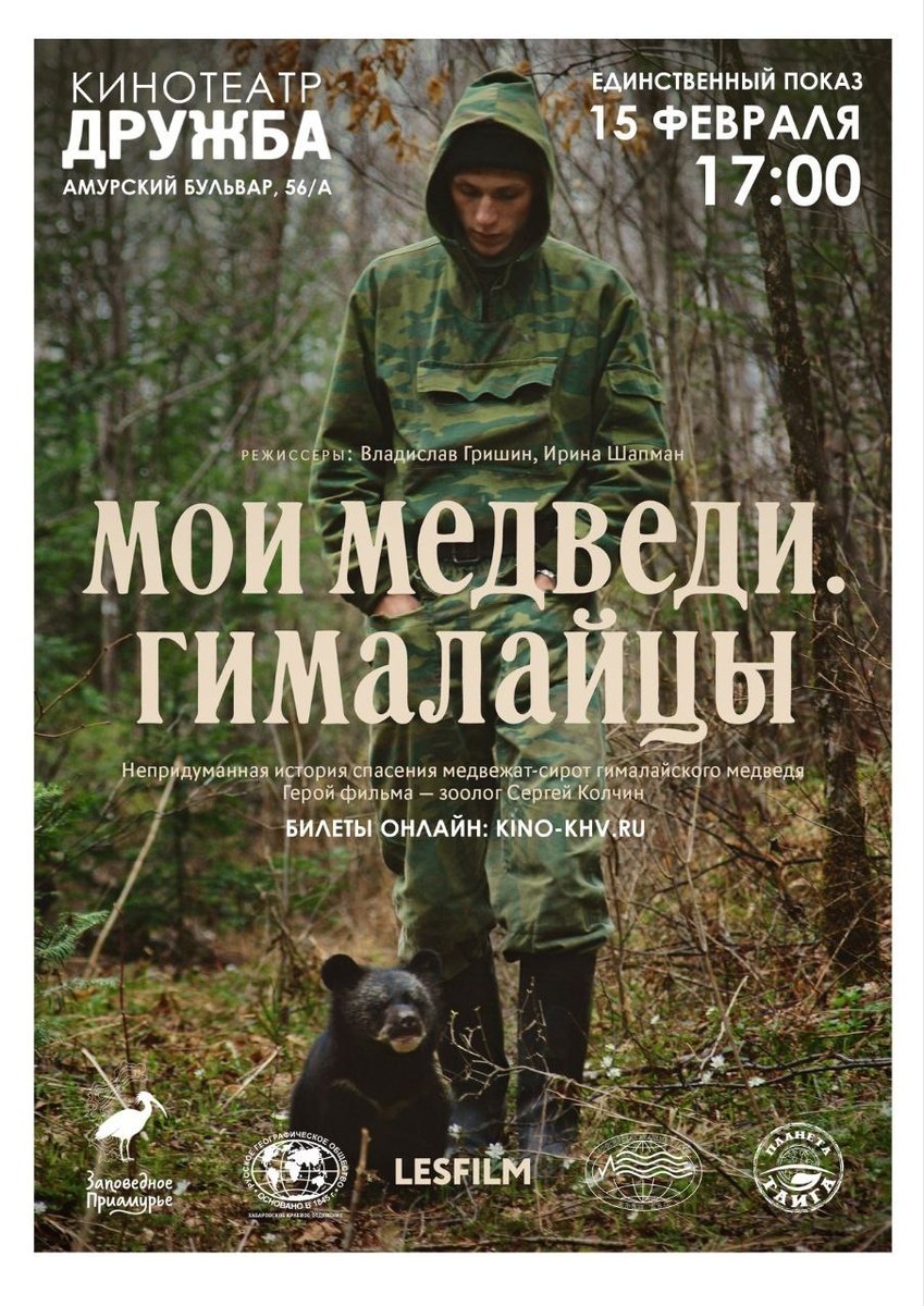 Гималайцы» ✔ премьера научно-популярного фильма о гималайских медведях ✔ реальная история реабилитации осиротевших медвежат ✔ уникальные документальные кадры жизни в тайге ✔ участие специалиста по крупным хищникам Сергея Колчина ✔ съёмки в уссурийской тайге Хабаровского края 📅 Когда: #15_февраля, 17:00 ⛳ Где: Кинотеатр «Дружба» 💳 Стоимость: 400 руб Билеты 👉 Афиша Хабаровска. Куда сходить, экскурсии