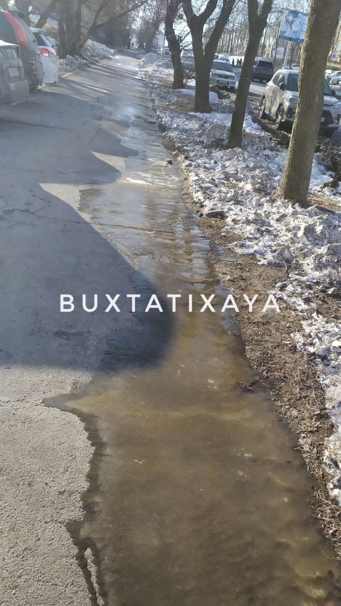 Утро начинается с потопа! Бежит, парит, каналезой не воняет! Со стороны сквера у 33школы. Из под сугроба, там колодец. Ливневка!?