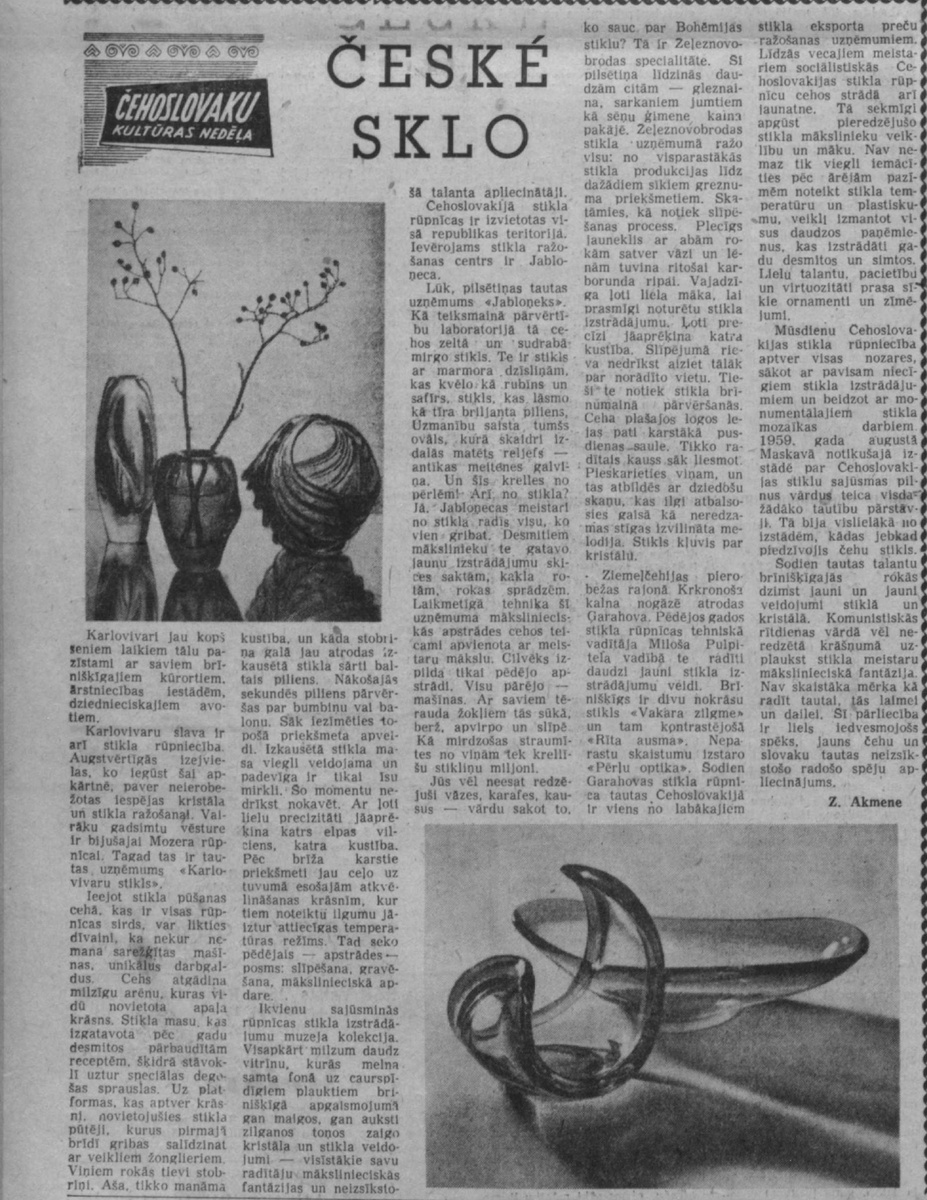 Наряду со старыми мастерами, молодежь стекольной промышленности социалистической Чехословакии успешно работает в мастерских, а также перенимает навыки и искусство опытных стеклодувов. Научиться определять температуру и пластичность стекла по внешним признакам, умело использовать все многочисленные техники, разработанные за десятилетия и столетия, — задача непростая. Такие орнаменты и рисунки требуют большого таланта, терпения и виртуозности стеклоделия. Современная чехословацкая стекольная промышленность охватывает все секторы, от самых незначительных изделий из стекла до монументальных мозаик. На выставке чехословацкого стекла, состоявшейся в Москве в августе 1959 года, представители разных национальностей восторженно отзывались о ней. Это была самая масштабная выставка в истории чешского стекла. Сегодня в чудесных руках народных талантов рождаются новые и новые творения из стекла и хрусталя. Во имя коммунистического завтра художественная фантазия мастеров-стеклодувов расцветает в невиданном великолепии. Нет более прекрасной цели, чем творить для людей, это источник радости и красоты. Эта убежденность является мощной вдохновляющей силой, новым доказательством неисчерпаемых творческих способностей чешского и словацкого народов.