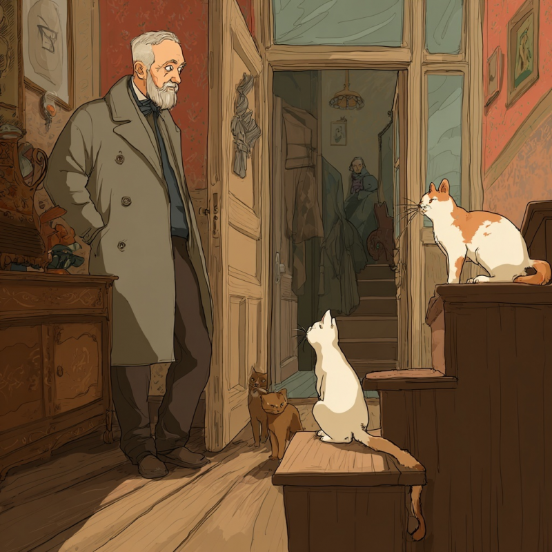 Пётр Максимович в гостях у Якова Борисовича, пожилого, одинокого, но с буйной, когда подопьёт, соседкой по квартире. Да, двухкомнатная квартира на два одиноких сердца. Что можно сказать о Якове? Он очень любит своих кошек. Их две: белая и рыжая. Когда приходит Максимыч, то он им прямо заявляет, торжественно: — Выходите, это Петя пришёл. Не бойтесь, он вас не обидит. — Из-под дивана тут же высовывается кошачья мордашка, с таинственным звуком, они обе покидают деревянную пещерку. Несколько лет Борисыч хочет лечь в больницу по состоянию здоровья, но не знает, кому доверить пушистиков. Соседка не любит посторонних. Однажды она так и заявила: «Чтоб никаких знакомых! Грязи после них! Выметай потом». Но когда приходит Максимыч, соседка через стенку подслушивает их беседу — любопытства ради, а может, из злобы, иль вовсе завидует, ведь на её пропитом лице всё написано. — В девяностых, помнишь, Борисыч, были ещё тыщи, зелёные, крупные? — Да, а как же! — В те школьные годы я посещал театральный к