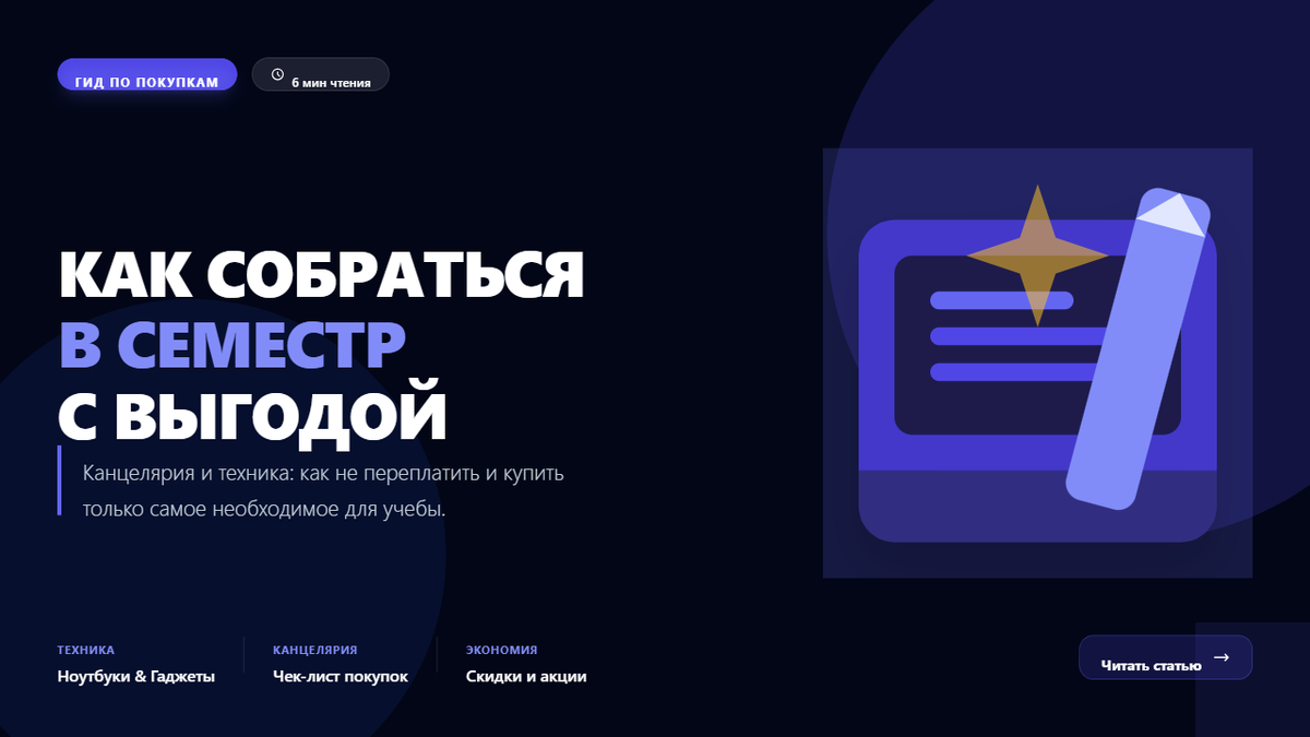 Начало нового семестра — это всегда волнительно. Новые предметы, встречи с друзьями и, конечно же, необходимость обновить свой учебный арсенал. Для многих подготовка к учебному году ассоциируется с огромными тратами, но это вовсе не обязательно должно быть ударом по кошельку. Грамотное планирование поможет вам приобрести все необходимое, сохранив бюджет на развлечения и кофе. В этой статье мы расскажем, как составить идеальный чек-лист покупок к семестру и найти баланс между ценой и качеством. Первое правило экономного студента — не покупать лишнего. В отличие от школы, список канцелярии в университет гораздо короче. Вам не понадобятся цветная бумага или десятки контурных карт. Стандартный набор первокурсника обычно включает: Но как сэкономить на канцелярии? Избегайте покупок в книжных магазинах в центре города в пик сезона. Лучше всего искать где купить дешевую канцелярию на маркетплейсах или в оптовых гипермаркетах, объединившись с одногруппниками. Покупая упаковку тетрадей на всех,