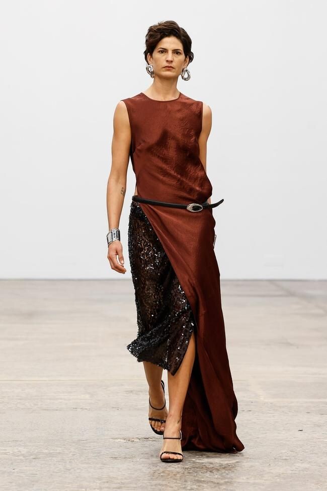 Если платье матовое и плотное, все остальное не должно быть таким же. Коричневый любит соседство с чем-то менее «глухим»: гладкой кожей, мягким трикотажем, деликатным блеском, текучей тканью. Это не про контраст ради контраста, а про ощущение движения.