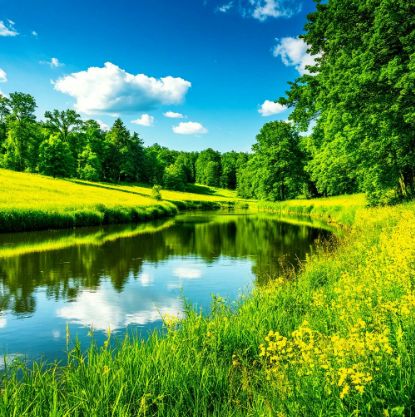 Всем доброго времени суток! На изображении представлена живописная летняя природа. В центре композиции протекает спокойная река, отражающая голубое небо и белые облака. По обе стороны реки раскинулись зелёные луга, покрытые густой травой и яркими жёлтыми цветами. На заднем плане видны густые деревья, создающие ощущение уединения и уюта. Небо ясное, с небольшими облаками, что подчёркивает солнечную и тёплую атмосферу. Это место идеально подходит для прогулок, отдыха на природе или вдохновения для творчества. На изображении представлен живописный летний пейзаж. На переднем плане раскинулся яркий луг, покрытый цветущими одуванчиками и ромашками. Зелёная трава переливается на солнце, создавая ощущение свежести и тепла. На заднем плане видны холмы, покрытые густым лесом, который плавно переходит в горизонт. Небо ясное, голубое, с пушистыми белыми облаками, что добавляет картине лёгкости и воздушности. Этот пейзаж передаёт атмосферу спокойствия и гармонии с природой, идеально подходящую для