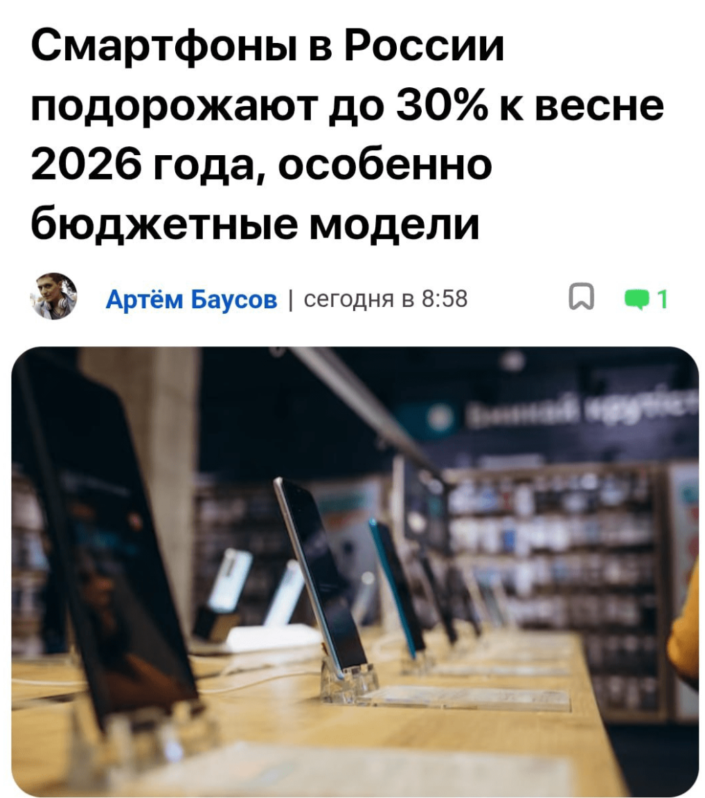 Всё из-за ИИ-бума и кризиса памяти — новые партии девайсов закупают уже по повышенным ценам. Главное — смартфоны ПРОДОЛЖАТ дорожать в течение года из-за роста НДС, новых систем маркировки и технологического сбора. Обновляемся, пока не поздно.