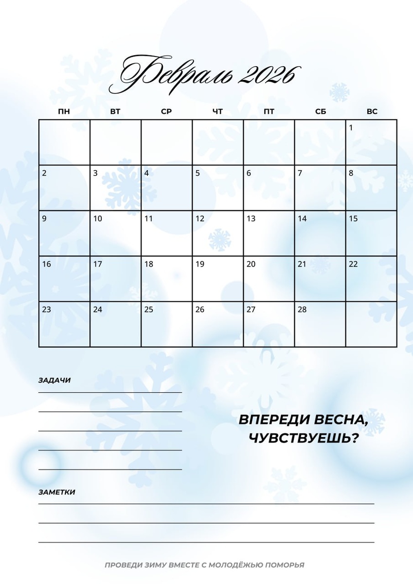 Но точно не у нас! Молодёжь Поморья не поддаётся хандре: мероприятия, съёмки, проекты и волонтёрские акции превращают зимние дни в пространство для самовыражения и роста. ⚡️ Следи за новостями — завтра анонсируем ключевые события февраля! А пока лови планер на месяц, туда впишем все важные даты. На страже твоего настроения вместе с национальным проектом «Молодёжь и дети». #молод29 #Команда29 #нацпроекты #молодёжьидети