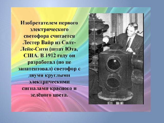 Первые шаги (1868-1869) 10 декабря 1868 года в Лондоне возле Британского парламента появился первый в мире светофор. Его создателем стал Джон Пик Найт, специалист по железнодорожным семафорам. Устройство представляло собой: 7-метровый столб с двумя механическими стрелками Газовый фонарь для работы в темное время Систему ручного управления полицейским Сигналы работали так: Горизонтальное положение стрелок — стоп Угол 45° — движение с осторожностью Красный и зеленый свет от газового фонаря Первые неудачи 2 января 1869 года произошел несчастный случай — газовый фонарь взорвался, пострадал регулировщик. После этого в Европе временно отказались от использования светофоров. Эпоха электричества 1910 год — Эрнст Сиррин из Чикаго запатентовал первую автоматическую систему светофоров с надписями Stop и Proceed. 1912 год — Лестер Вайр создал первый электрический светофор с красными и зелеными сигналами. 1914 год — в Кливленде установлены первые электрические светофоры системы Джеймса Хога, управ