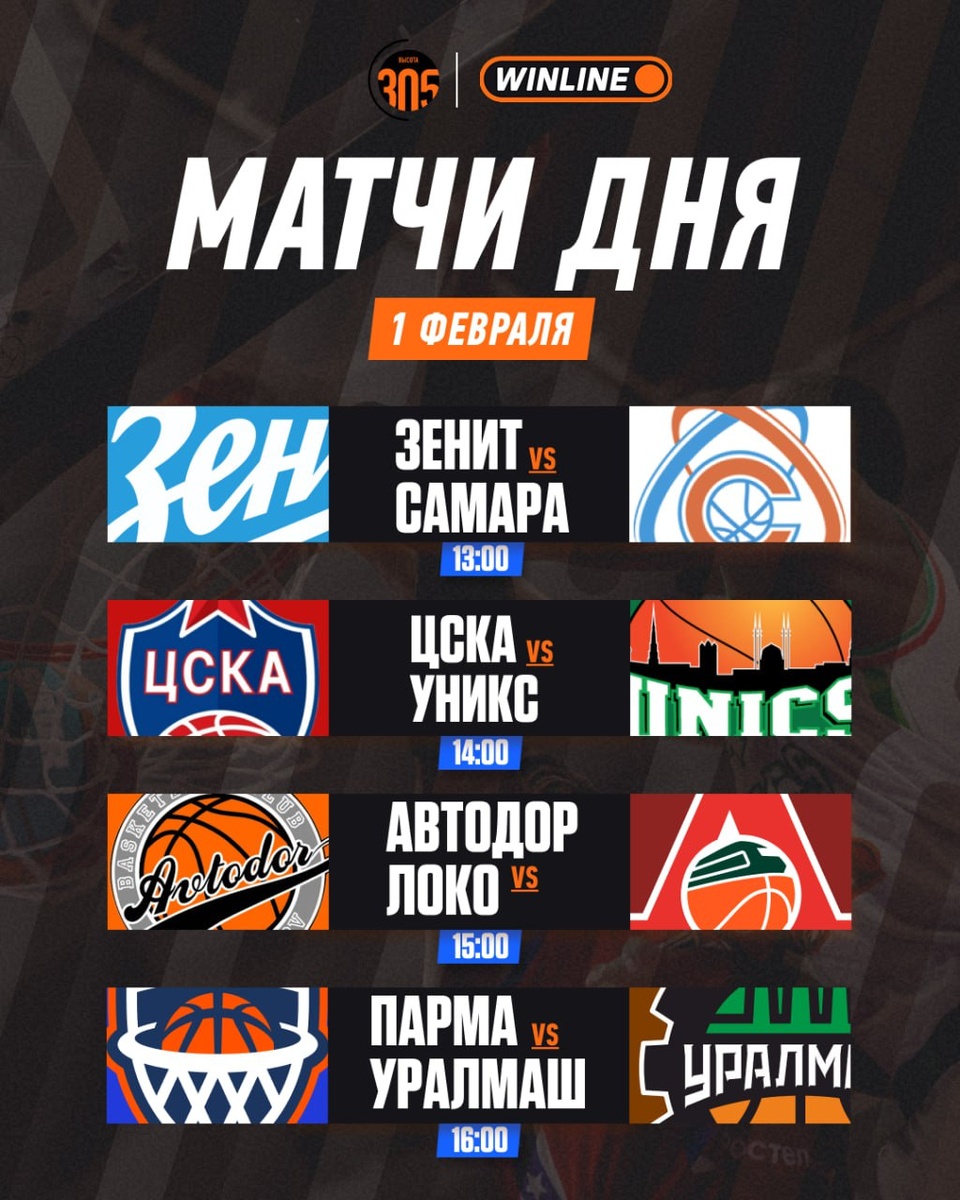 ! ⚡Начинается игровой день в Санкт-Петербурге встречей «Зенита» и «Самары». 🏟🏟🏟 Далее WINLINE Матч недели ЦСКА — УНИКС! 🔝 «Локо» после поражения в Екатеринбурге постарается реабилитироваться в Саратове во встрече с «Автодором». 🔥 Закроет выходной уральское дерби «Парма» — «Уралмаш». 🏀 БУДЬ НА ВЫСОТЕ — ПОДПИШИСЬ!