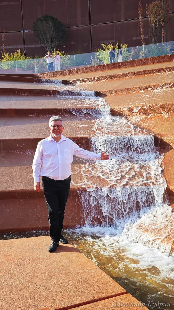 конечно же, в парке Галицкого. «Каньон» или «Амфитеатр воды»: Гранд-Каньон, собранный из Lego Отстояв небольшую очередь, спускаюсь по лестнице вниз. И... обалдеть. Это не просто водопад. Это целый инопланетный ландшафт, который открылся в «Парке Облаков» осенью 2025 года. Представьте стены насыщенного кирпично-красного цвета, которые то ли отсылают к американскому Гранд-Каньону, то ли к пирамидам инков, решайте сами. А по ним струятся, журчат и ниспадают каскады воды. Шум настолько мощный, что он полностью стирает шум города. Тут есть где разгуляться: прогулочные дорожки позволяют рассмотреть всё со всех сторон, а многоуровневые скамейки — зависнуть и медитировать на воду. Важный лайфхак для родителей: сюда не пускают детей до 5 лет, а с 5 до 14 лет — только в сопровождении взрослых. Мера строгая, но понятная: проходы узковаты, а соблазн потрогать воду Показать полностью...